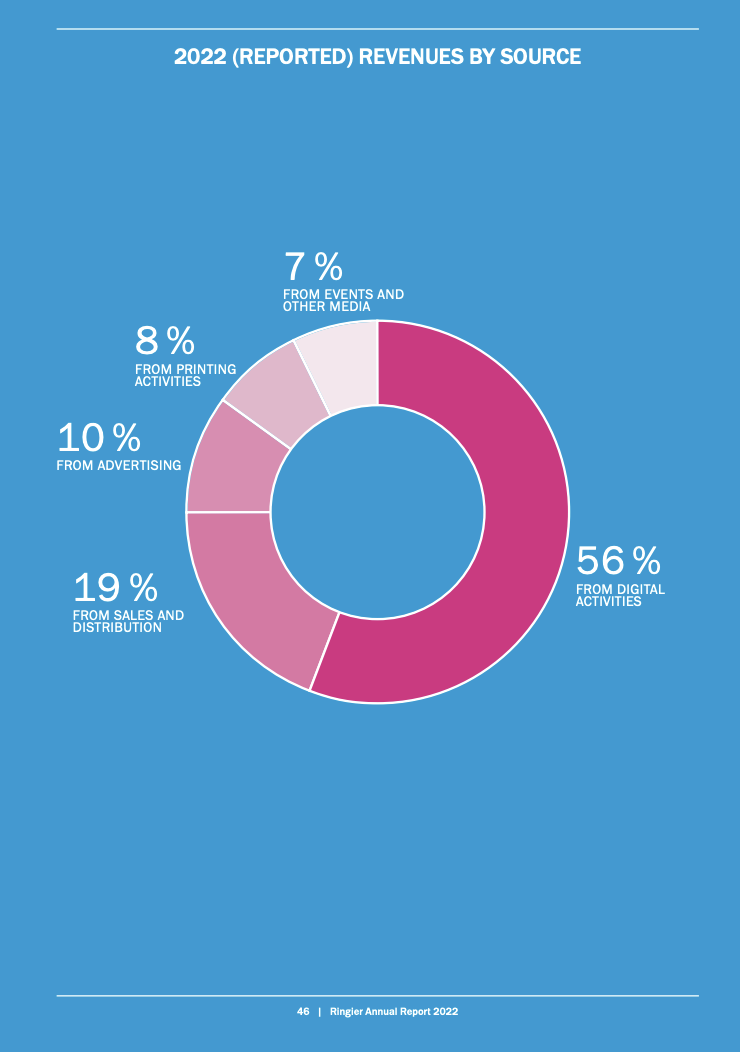 Alle verwiesen auf ihre Jahresberichte wie etwa die TX Group (dort gibt es Zahlen zur Werbung allgemein, Print/Online nicht getrennt). Ringier schickte mir einen Ausschnitt aus dem Jahresbericht 2022.