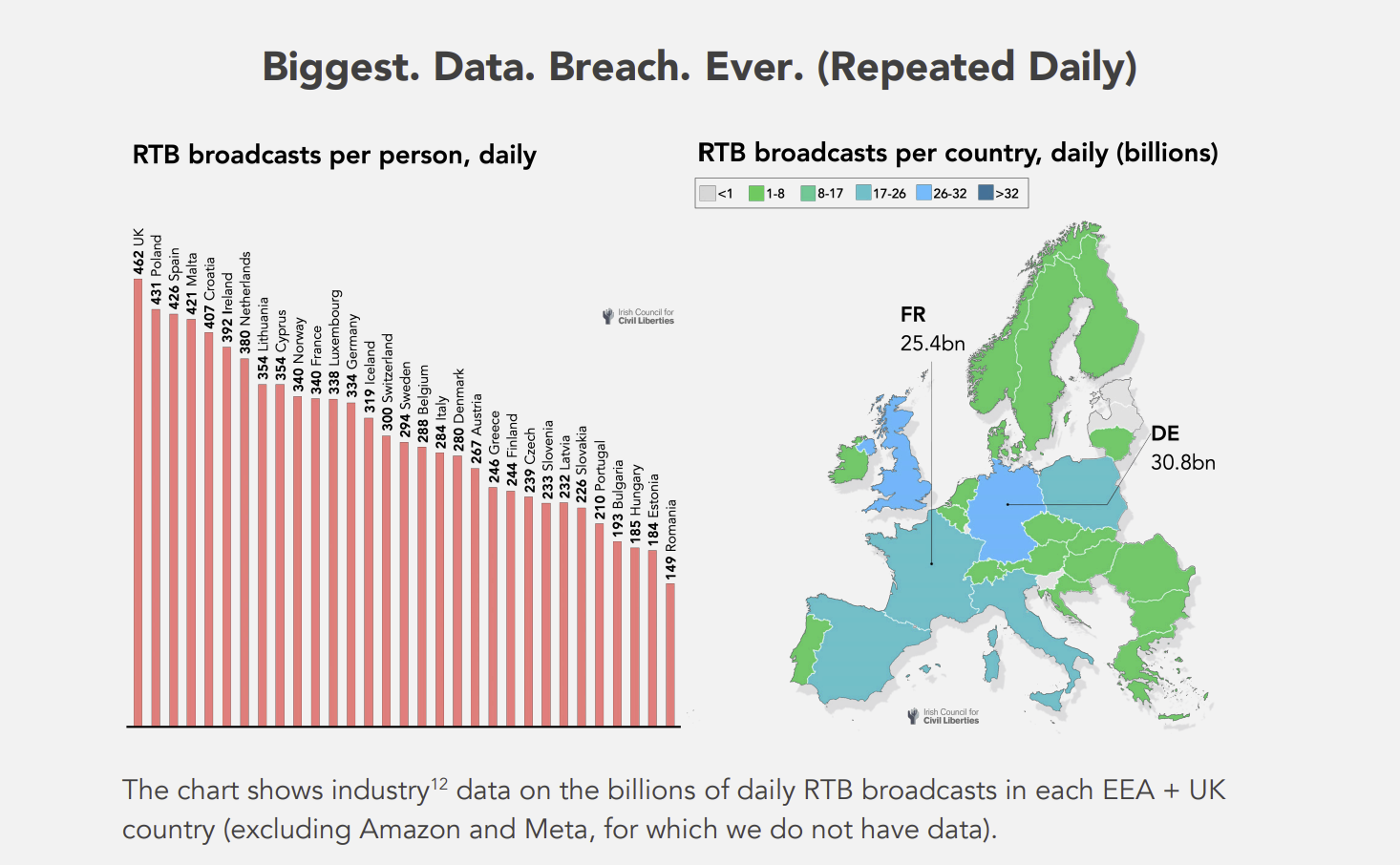 Die RTB-Daten (also: Real-Time-Bidding oder eben Echtzeitauktionsdaten) einer Person enthalten eine Unmenge an Informationen: Standorte von Leser:innen, was sie lesen, was sie schauen, persönliche Probleme wie Angstzustände etc. Die technischen Informationen wie Gerätedaten oder der Zeitstempel machen es einfacher dies einer konkreten Person zuzuordnen. Die Autoren kritisieren in ihrem Report die Standards der ganzen Online-Werbebranche, in der unkontrolliert und uneingeschränkt Informationen an 1000e von Firmen fliessen und belegen dies auch mit konkreten Zahlen.