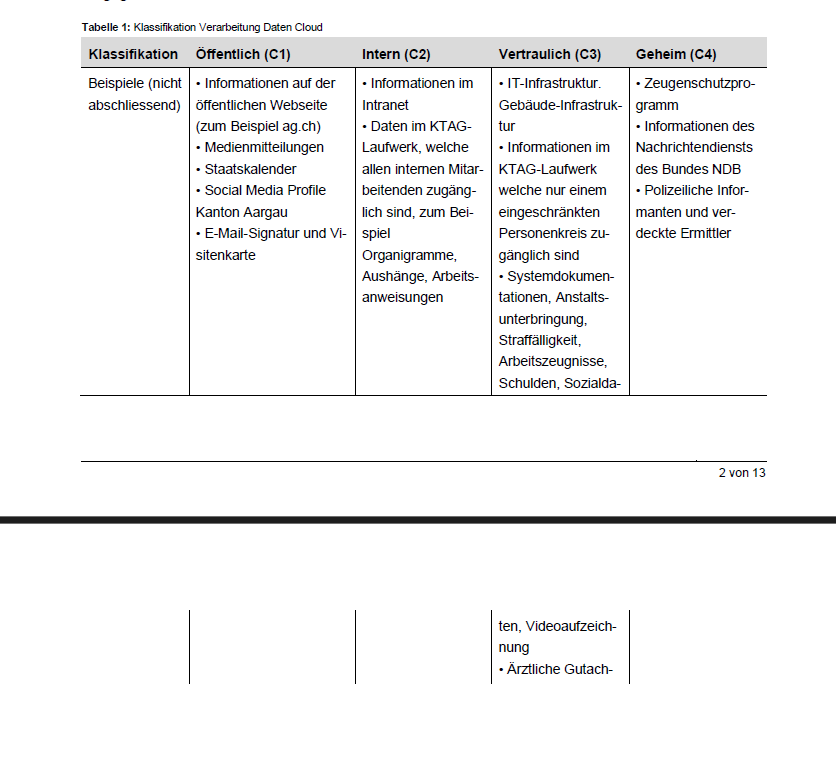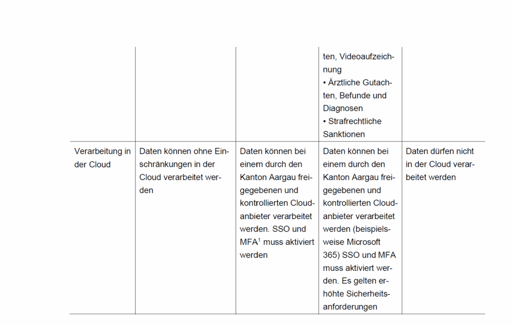 Ebenfalls erstaunlich ist, dass der Aargauer Regierungsrat alle Schutzstufen ausser GEHEIM in der amerikanischen Cloud speichern will. Darunter fallen auch Daten zur Anstaltsunterbringung, zur Straffälligkeit, zu Arbeitszeugnissen, Schulden, Sozialdaten, ärztlichen Gutachten und strafrechtlichen Sanktionen von Aargauerinnen und Aarguern, wie die Regierung in der Stufentabelle offenlegt.