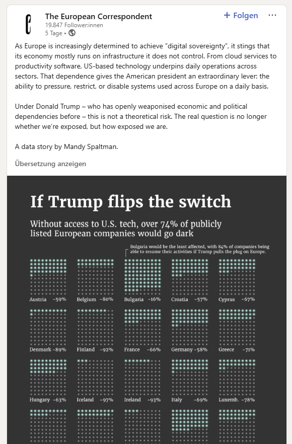 Das LinkedIn-Posting gibt dazu leider wenig Aufschluss. Die Journalist:innen schreiben: „As Europe is increasingly determined to achieve ‚digital sovereignty‘, it stings that its economy mostly runs on infrastructure it does not control. From cloud services to productivity software, US-based technology underpins daily operations across sectors. That dependence gives the American president an extraordinary lever: the ability to pressure, restrict, or disable systems used across Europe on a daily basis.