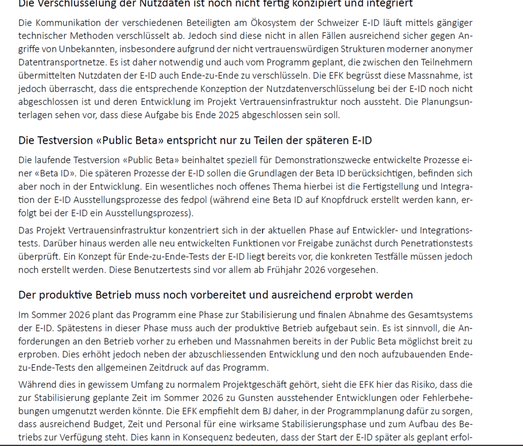 Nach der Lektüre des Berichts ist klar: Kritische Stimmen aus der Fachwelt wurden in allen Punkten bestätigt. So schrieb die Republik in ihrer Analyse vor der Abstimmung, dass besonders Kryptologen und Expertinnen für digitale Identitäten den ambitionierten Fahrplan des eID-Projektteams anzweifeln. Diese beteuerte auch nach dem knappen Abstimmungsresultat von 50.4 % im September 2025, dass man nach wie vor an der Lancierung im 2026 festhalten möchte.