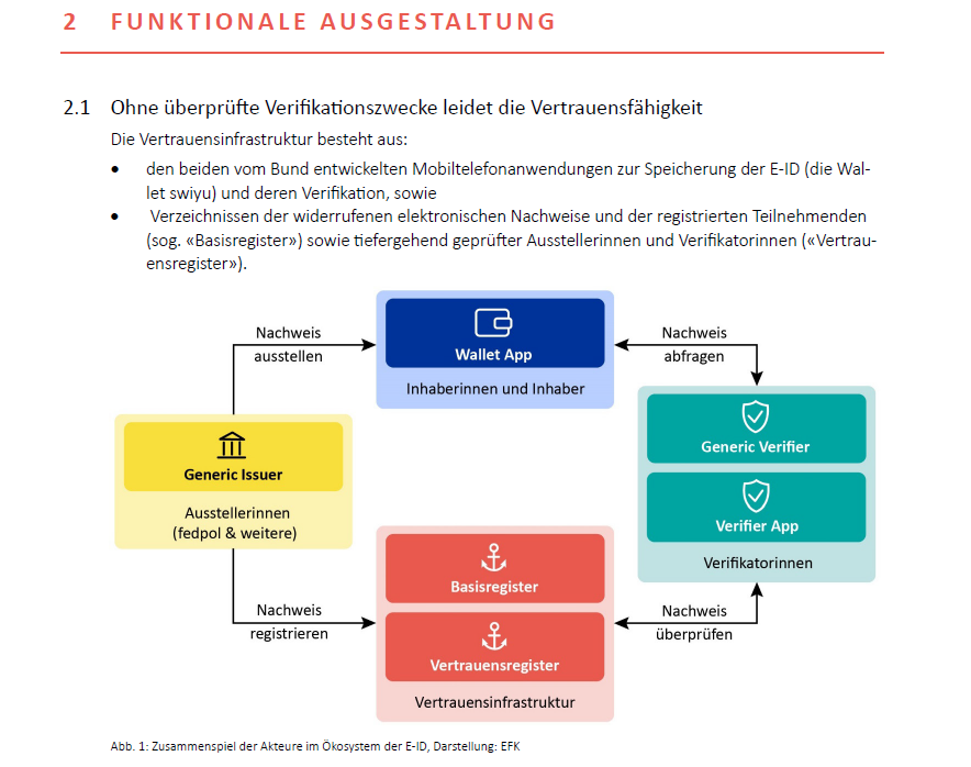 Hinsichtlich der EU ist ein weiterer Punkt interessant. Die EFK problematisiert hier die internationale Anerkennung der eID durch die EU, die vor allem eine politische Entscheidung sein wird. Dennoch sieht sie bei den technischen Voraussetzungen bzw bei den Sicherheitsniveaus eine Problematik. Die swiyu App und die vorgesehene Vertrauensinfrastruktur erfüllen bei der EU-Terminologie derzeit nur die Qualifikation „substanziell“ und nicht „hoch“.