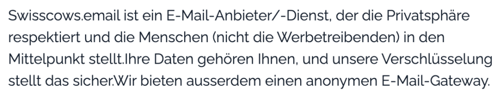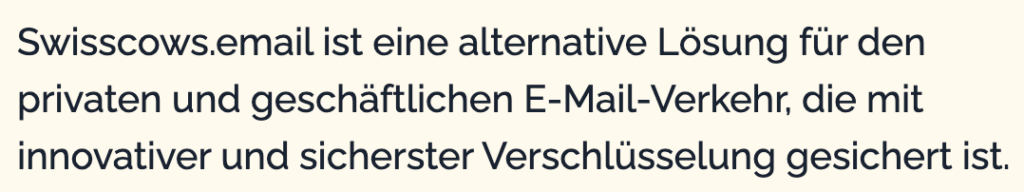 - Produkte wie Teleguard und Swisscows Email werden mit Schlagworten und Konzepten beworben, welche deutlich mehr zu versprechen scheinen, als sie real einhalten können.