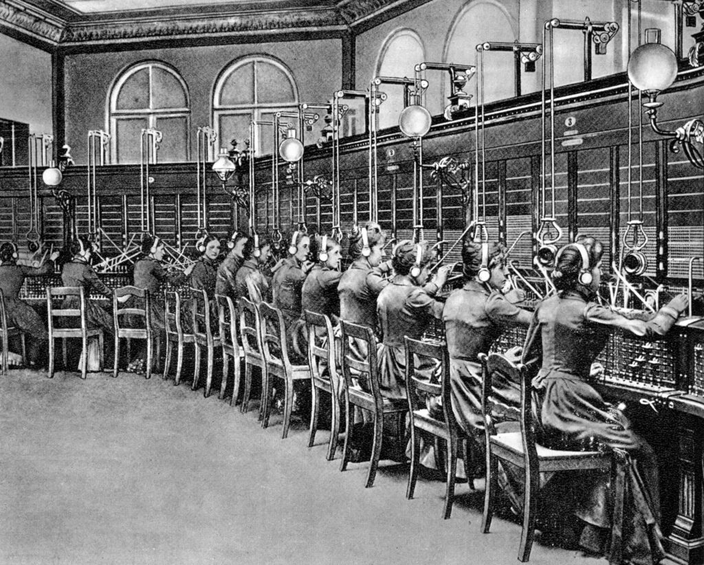 Eine der Eigenschaften, die sich durch viele Designentscheidungen im Internet zieht, ist die Vermeidung von unnötigem Aufwand. Insbesondere sollen die Router – anders als die Telefonistinnen beim Kabelstöpseln im 19. Jahrhundert (siehe Abbildung oben) – nicht Buch führen müssen über jeden einzelnen angeschlossenen Rechner oder über jede gerade laufende Verbindung. Das wären viel zu viele Informationen, die sich zudem dauernd ändern und Unmengen an Speicherplatz verschlingen würden.